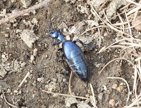 ツチハンミョウ の仲間です。青い大きな蟻の様です。大きいもので2cmになります。幼虫はハナバチにつかまって、巣に入り込み、彼らの餌で大きくなるそうです。有毒ですから、触らないでください。